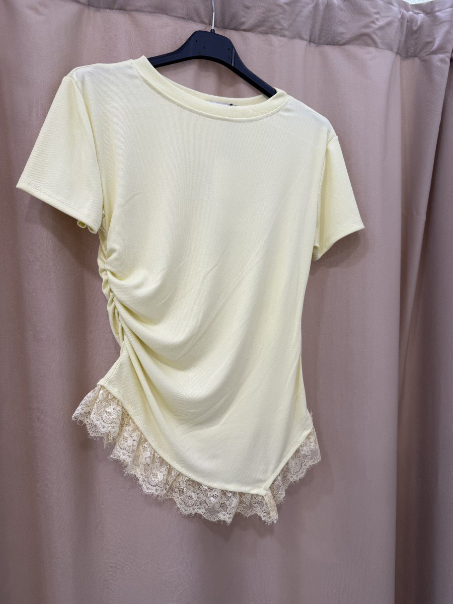 camiseta con detalle de encaje en el bajo y un fruncillo lateral con tejido en un fino canalé