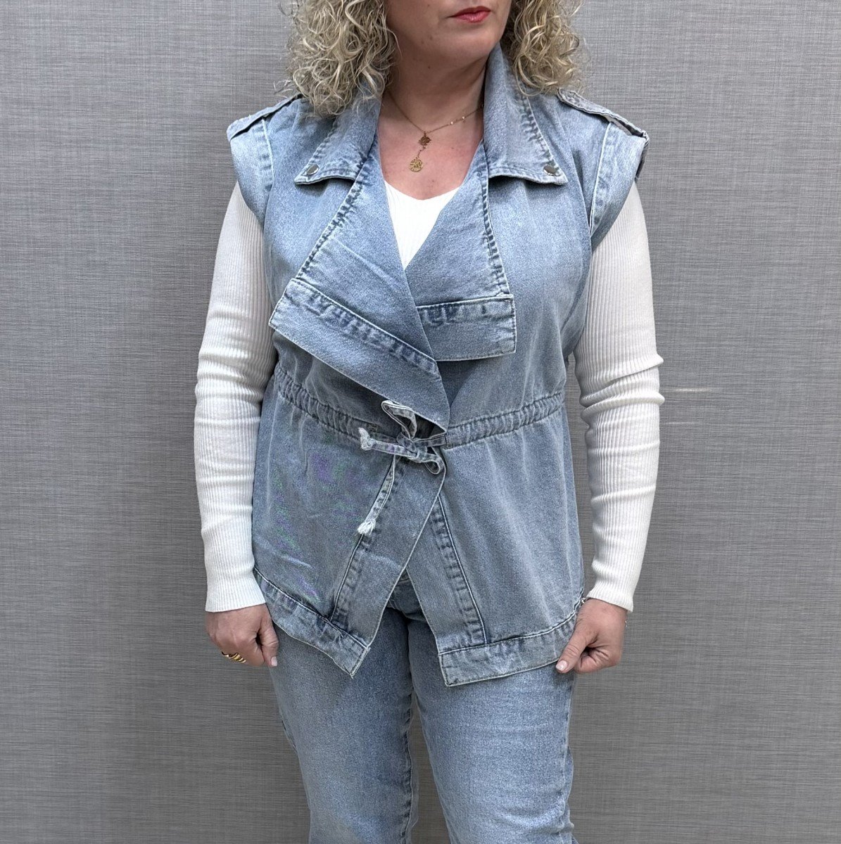 Chaleco vaquero sin mangas en denim claro, con diseño estructurado y corte ligeramente entallado que estiliza la silueta sin marcar.