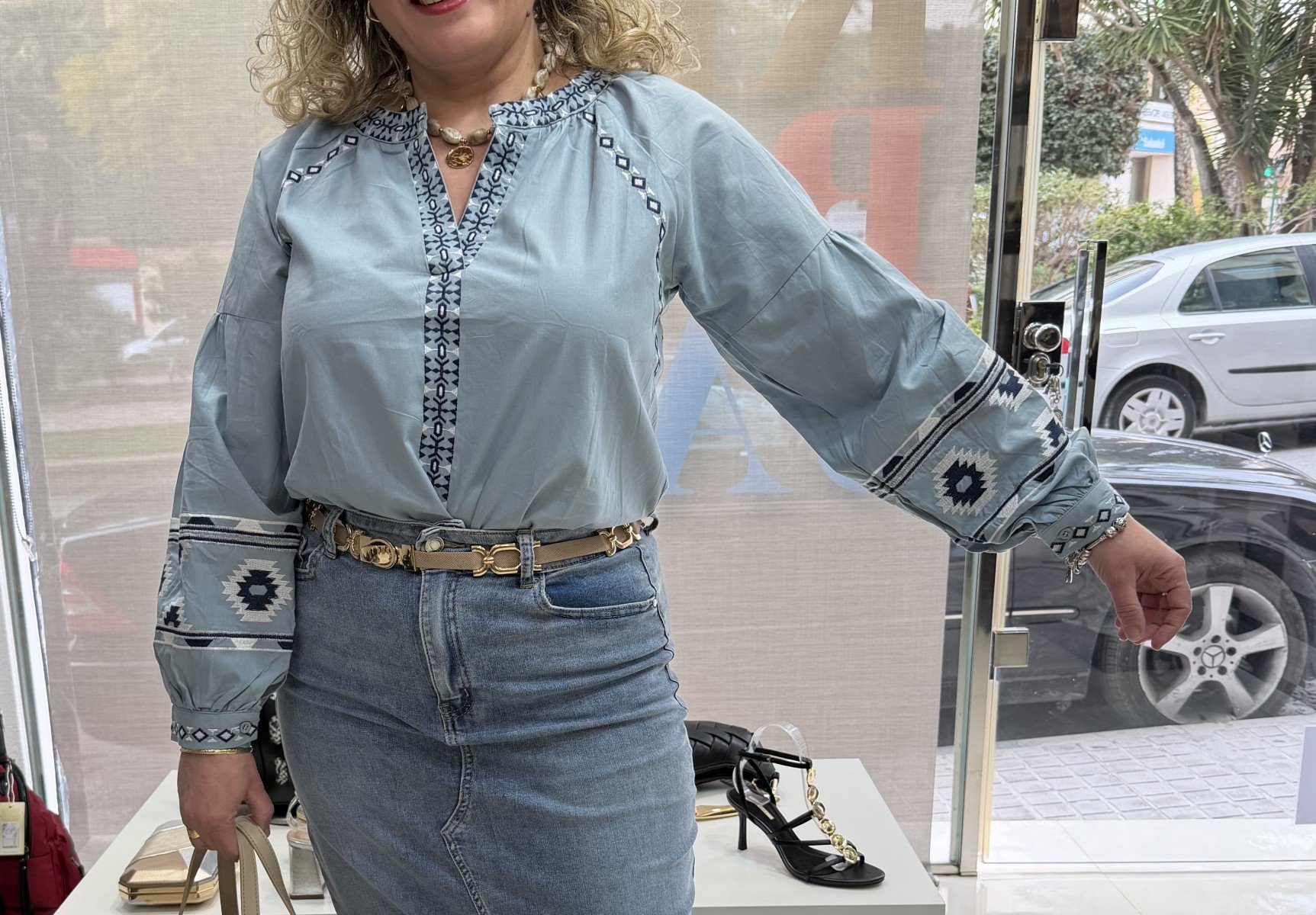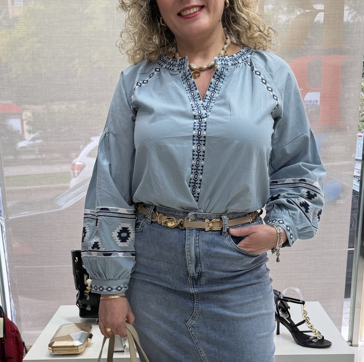 Camisa fluida en tono azul empolvado con delicados bordados geométricos en contraste en el escote y las mangas. Presenta cuello en pico que estiliza la figura y aporta un toque femenino y favorecedor.