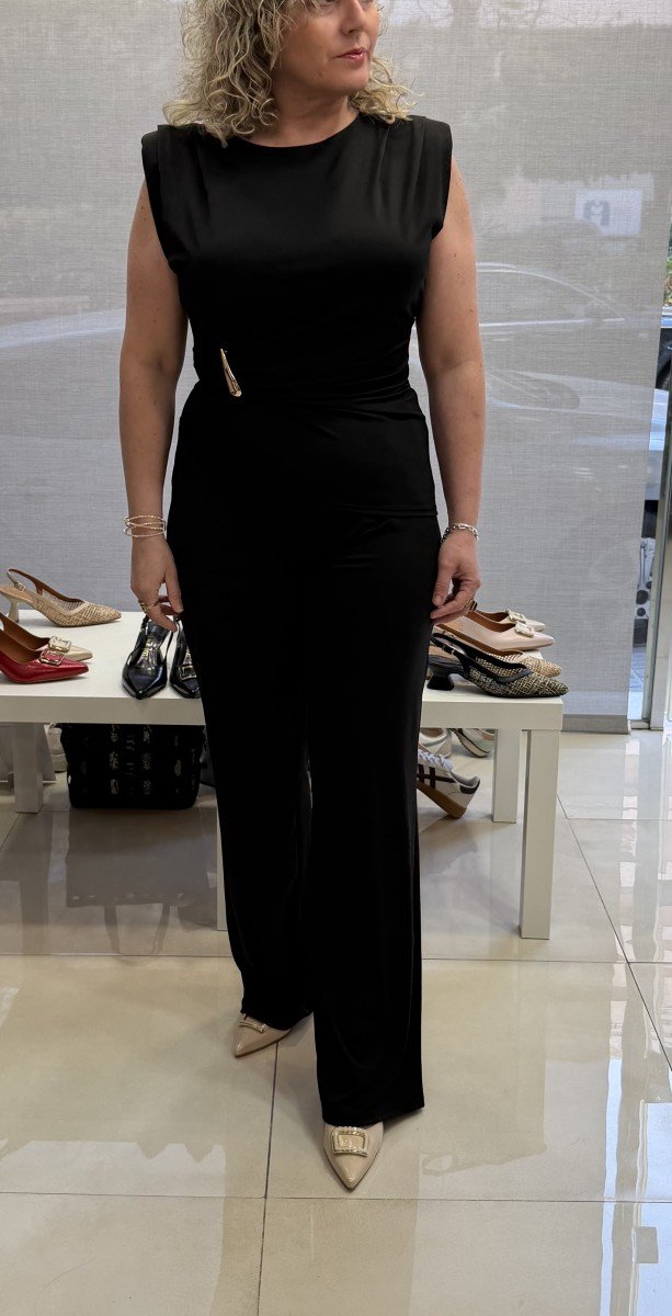 Conjunto sofisticado de dos piezas en color negro compuesto por top drapeado con hombreras y pantalón recto de pernera amplia con bolsillos . El top presenta detalle metálico lateral que aporta un toque moderno y elegante. Perfecto para looks de noche, eventos o estilismos formales con un aire contemporáneo.