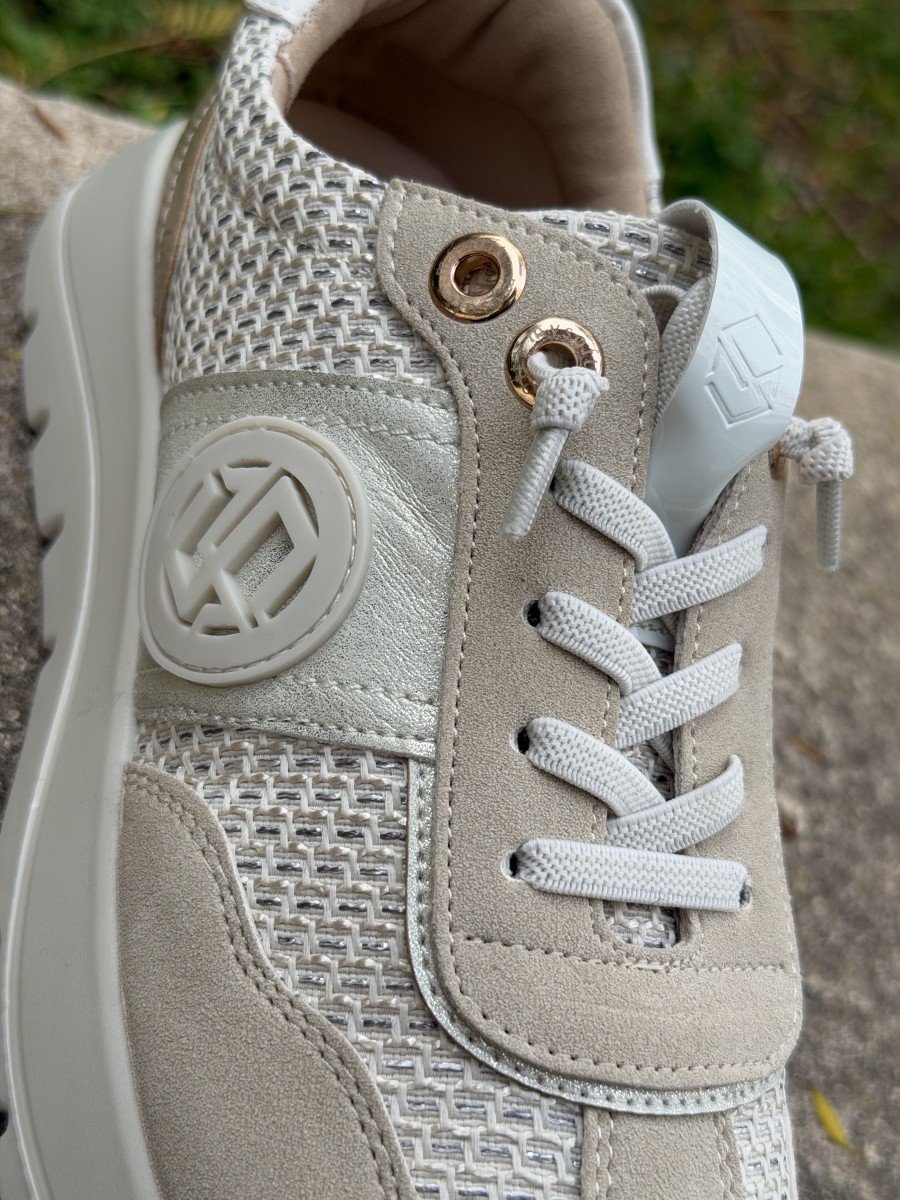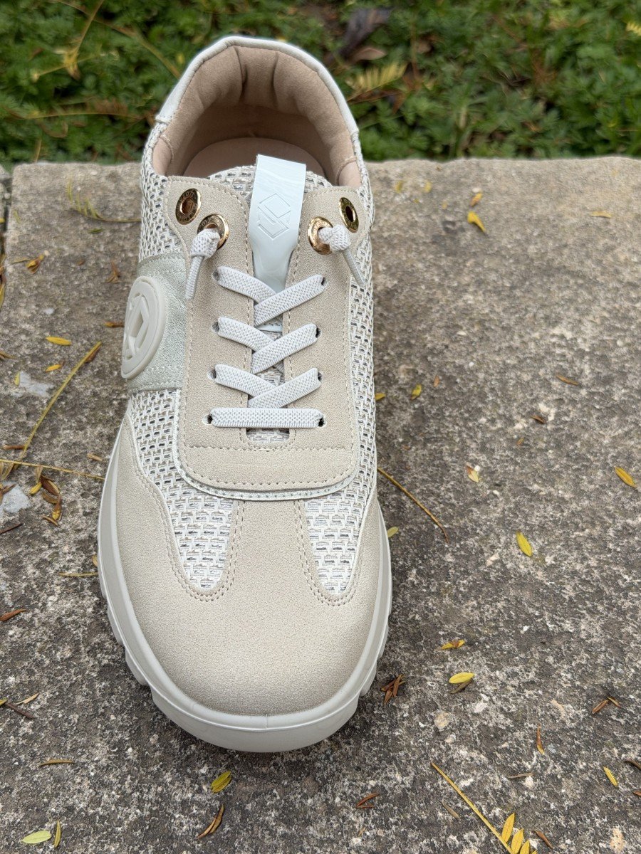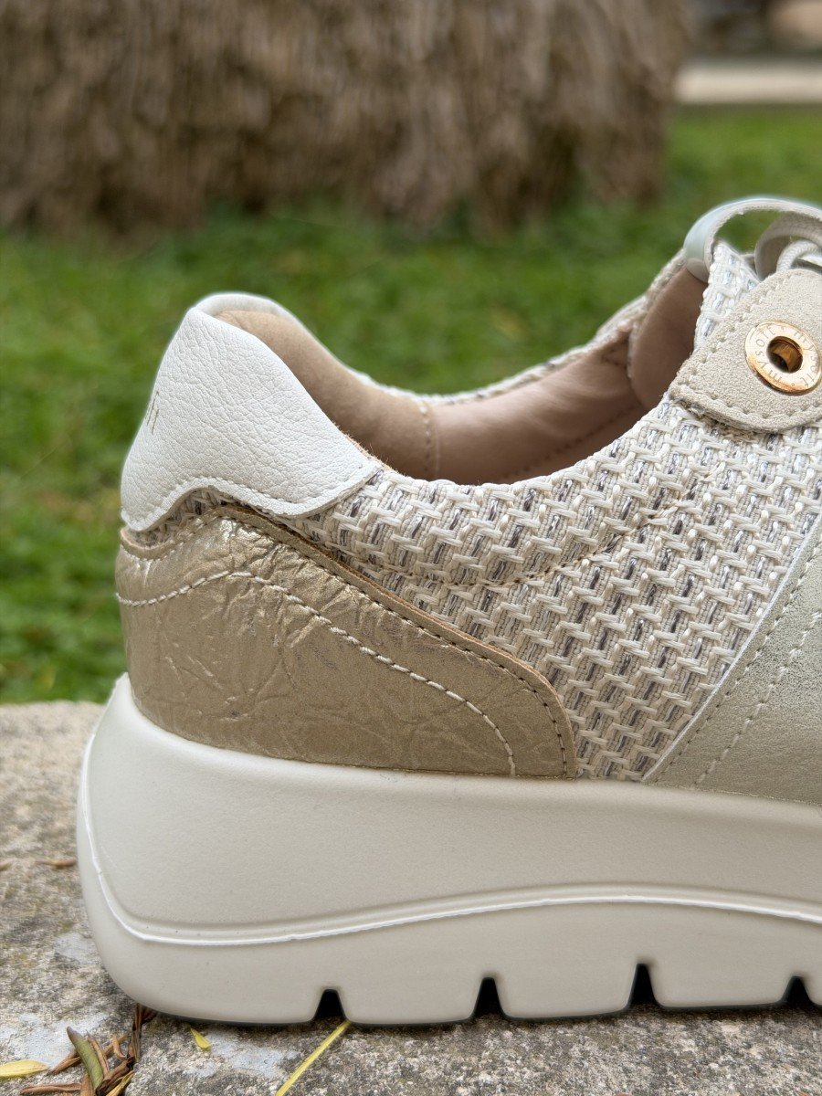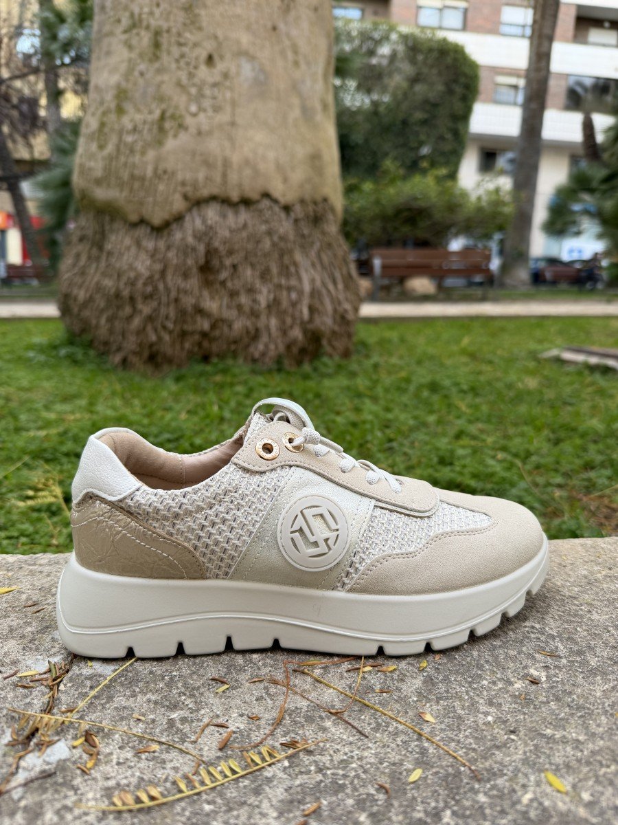 Zapatilla deportiva de estilo casual en tono beige claro, diseñada para ofrecer comodidad y un look actual. Combina paneles de malla transpirable con detalles en material efecto piel y acabados metalizados que aportan un toque moderno.