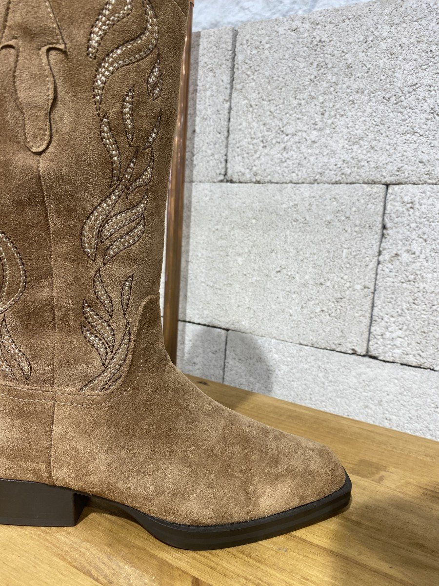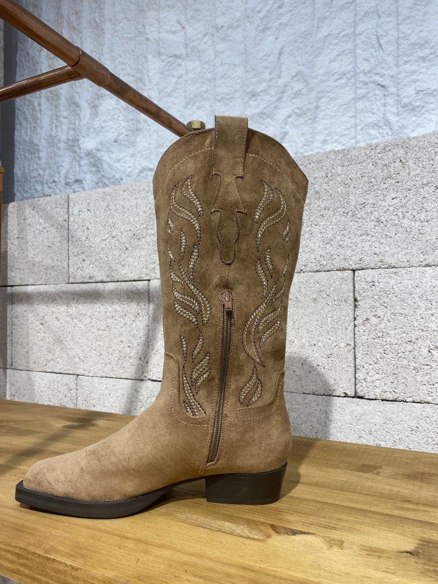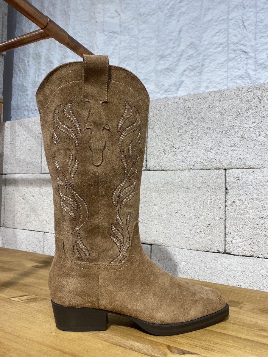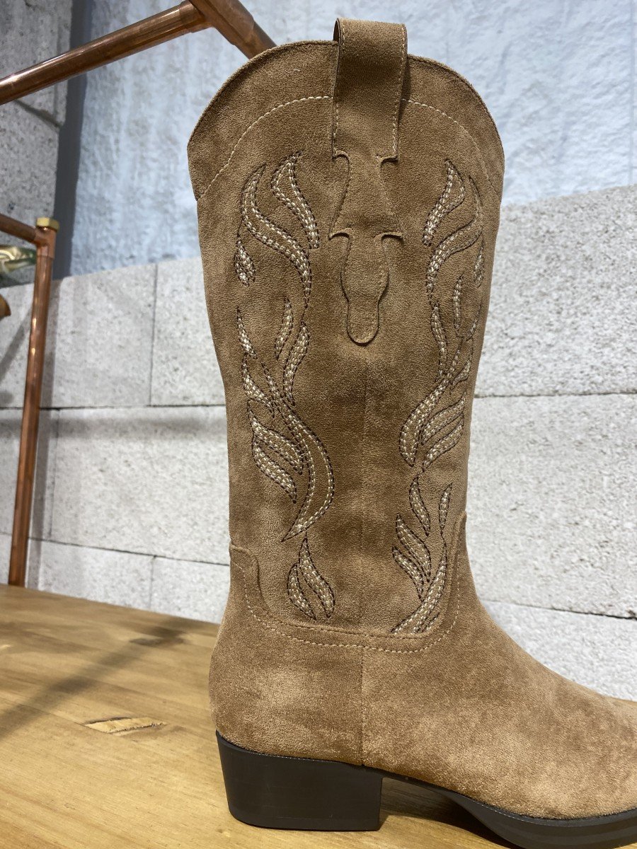 Confeccionada en ante camel de tacto suave, esta bota destaca por un bordado impecable que recorre la caña con curvas orgánicas, casi como si dibujara el movimiento del viento sobre la arena. Su tacón bajo y estable convierte cada paso en una invitación a caminar sin prisas, disfrutando de la comodidad sin renunciar al estilo.