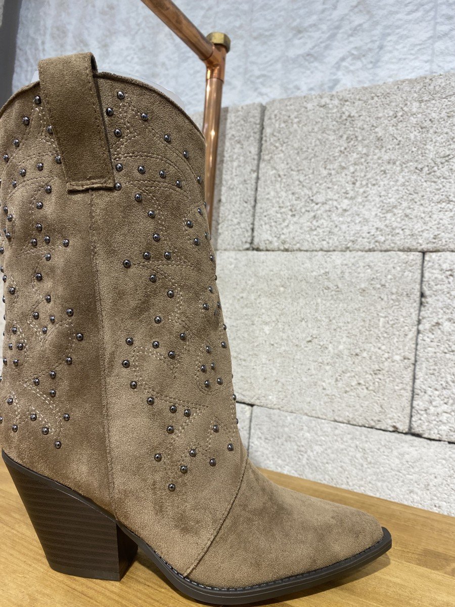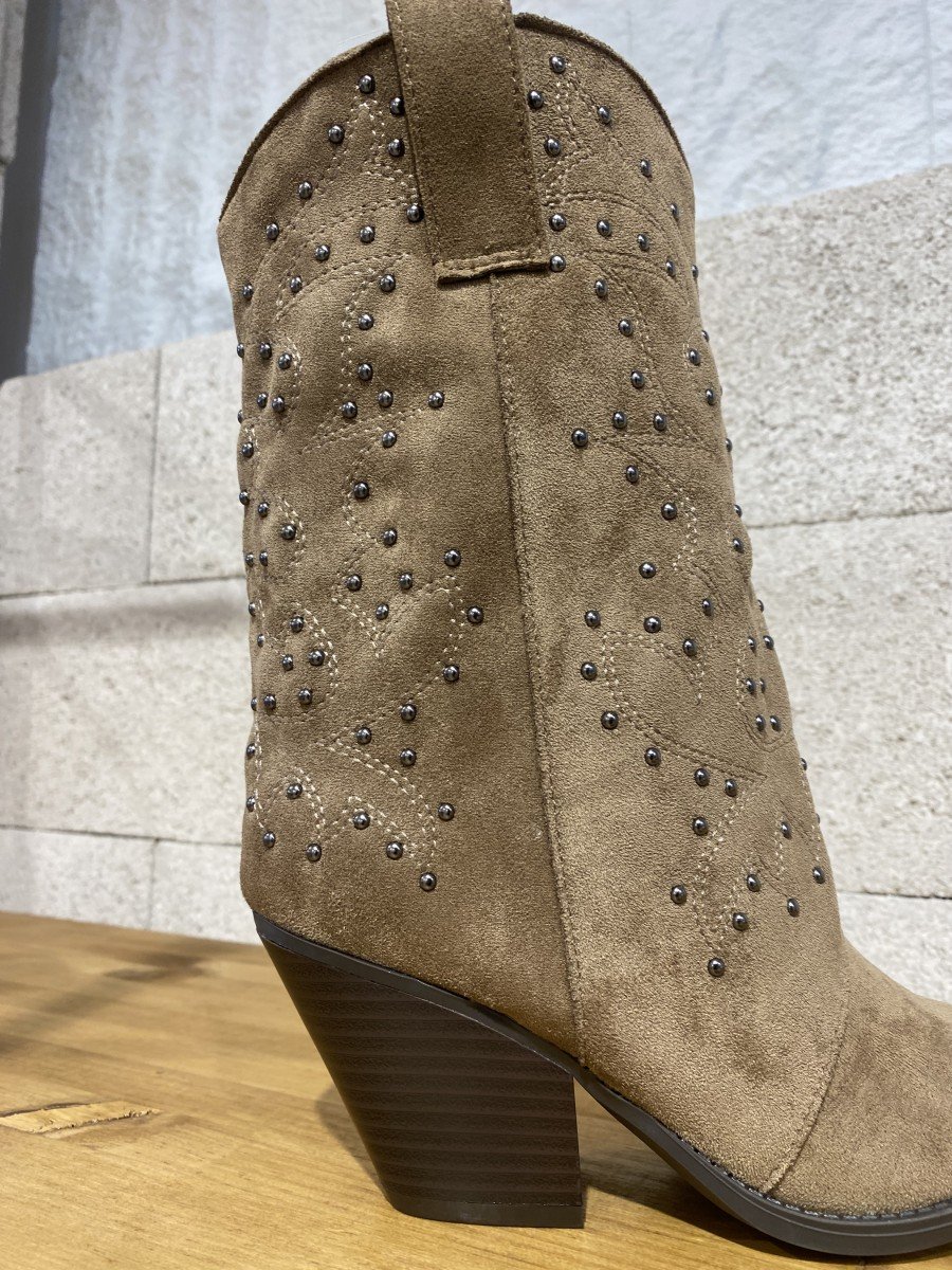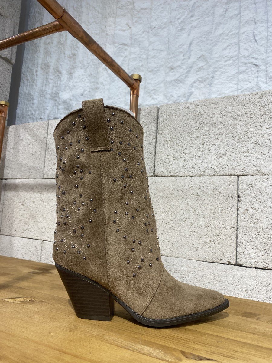 En un elegante tono taupe que combina con absolutamente todo, esta bota se adorna con tachuelas distribuidas de manera armoniosa, creando un diseño sutil pero con presencia. Su tacón cowboy aporta altura sin sacrificar la estabilidad, haciendo de este modelo un imprescindible para quienes buscan un calzado versátil, atemporal y lleno de personalidad.