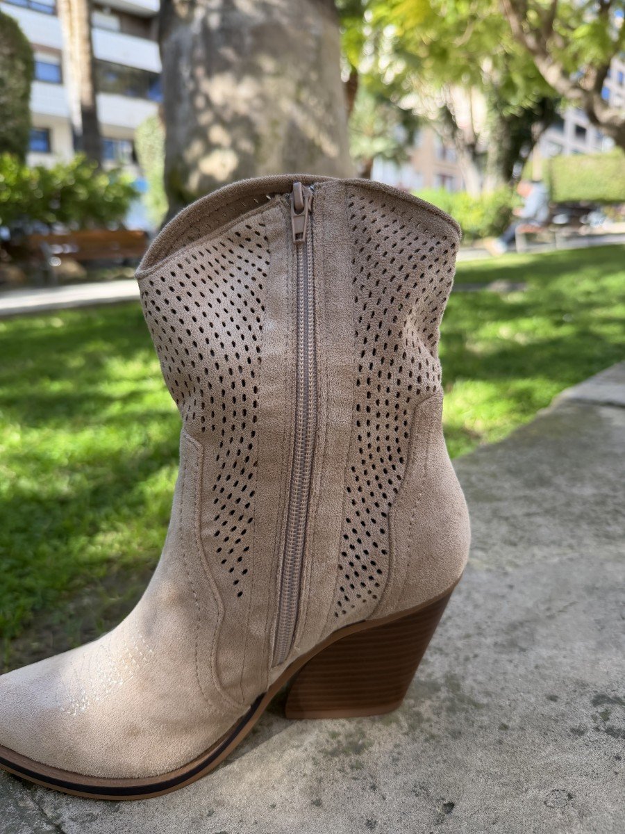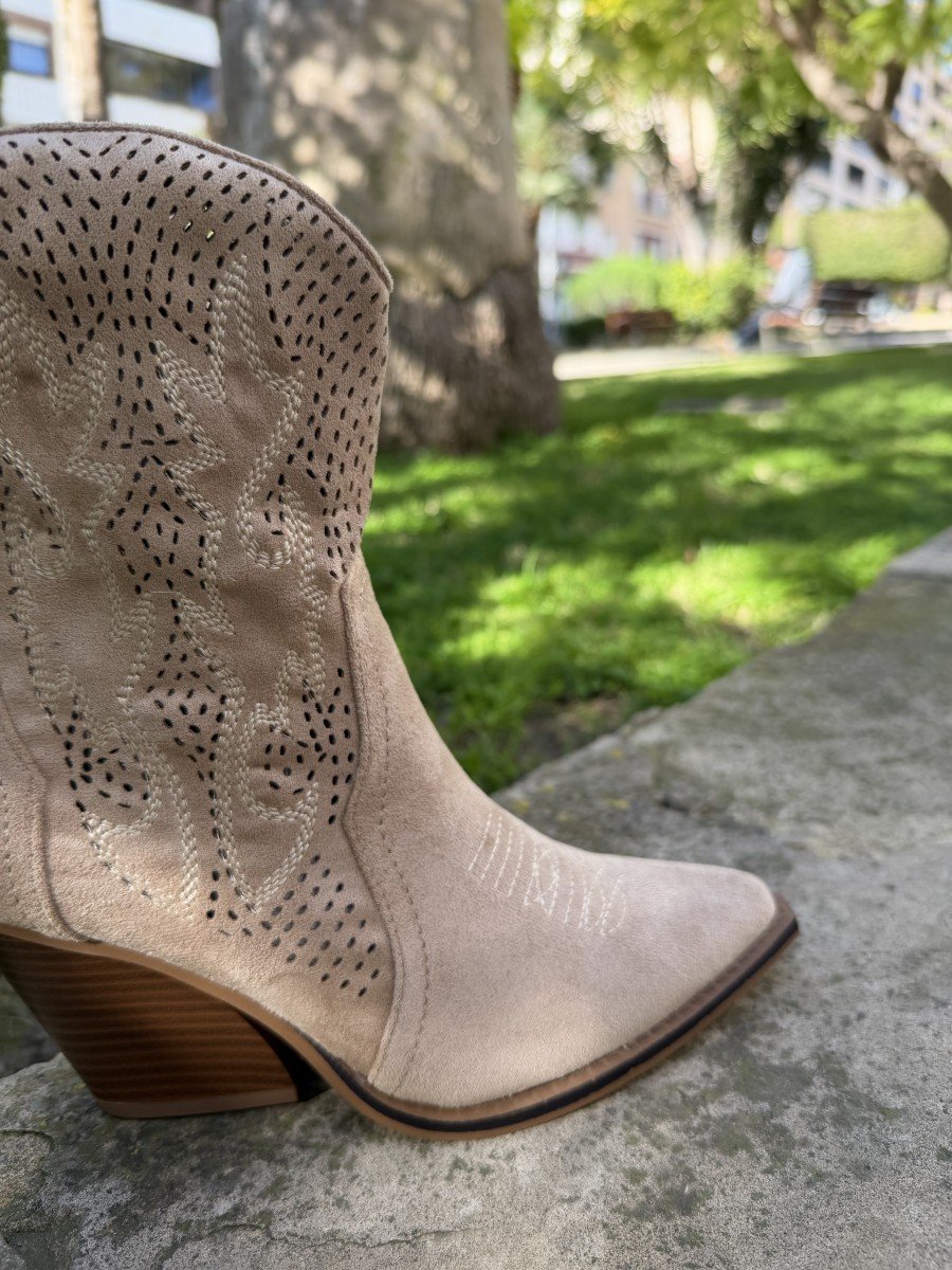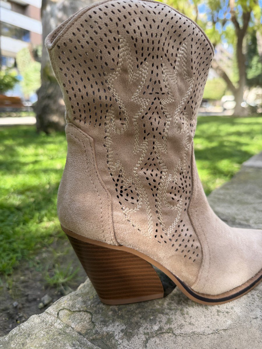 Atrévete con el estilo cowboy más actual con este botín western de tacón medio. Fabricado en material de alta calidad, presenta una caña media con bordados decorativos que aportan carácter sin perder la elegancia. Su diseño afilado en la punta y el tacón ancho de 7 cm estilizan la figura manteniendo la comodidad en cada paso.