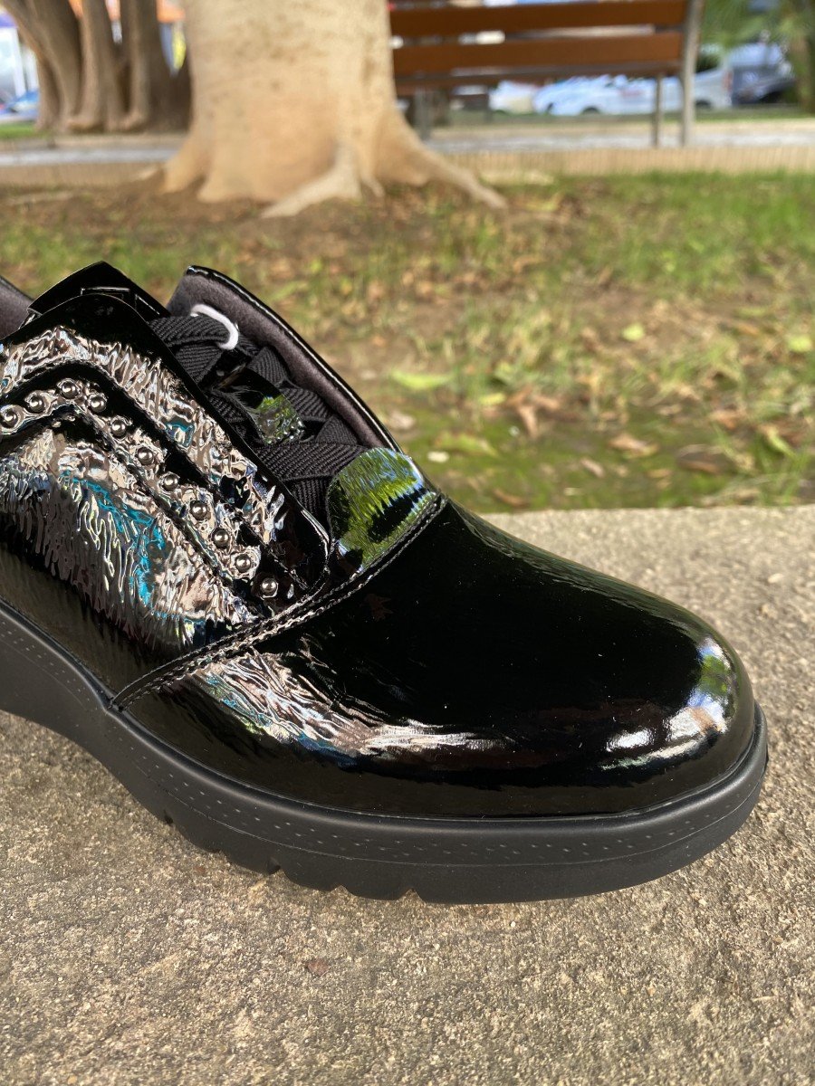 Clasico y atemporal este zapato urbano en charol negro es un imprescindible para cualquier armario. Su diseño monoclomático con acabado brillante aporta sobriedad y versatilidad, combinando a la percepcion tanto con looks de diario como mas arreglados.